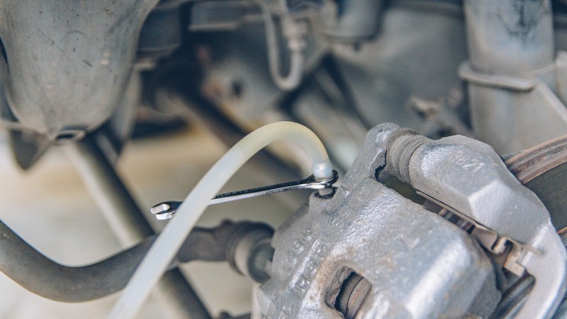 For a routine bled, start with the caliper furthest away from the master cylinder, passenger side rear caliper. Attach a line to the bleeder valve and crack open the bleeder until fluid begins to run through the lines.