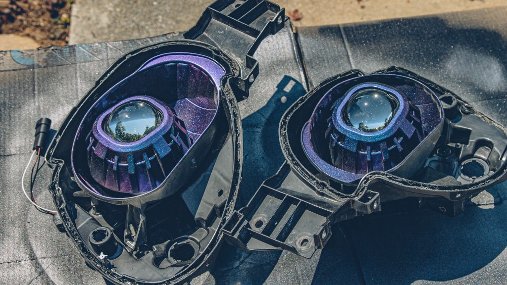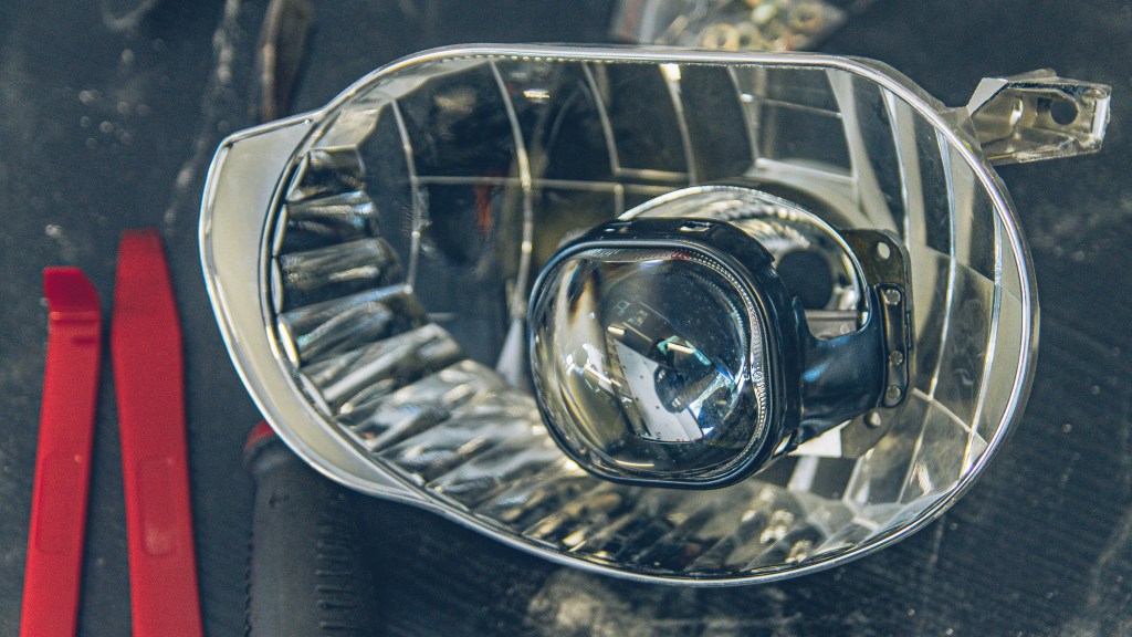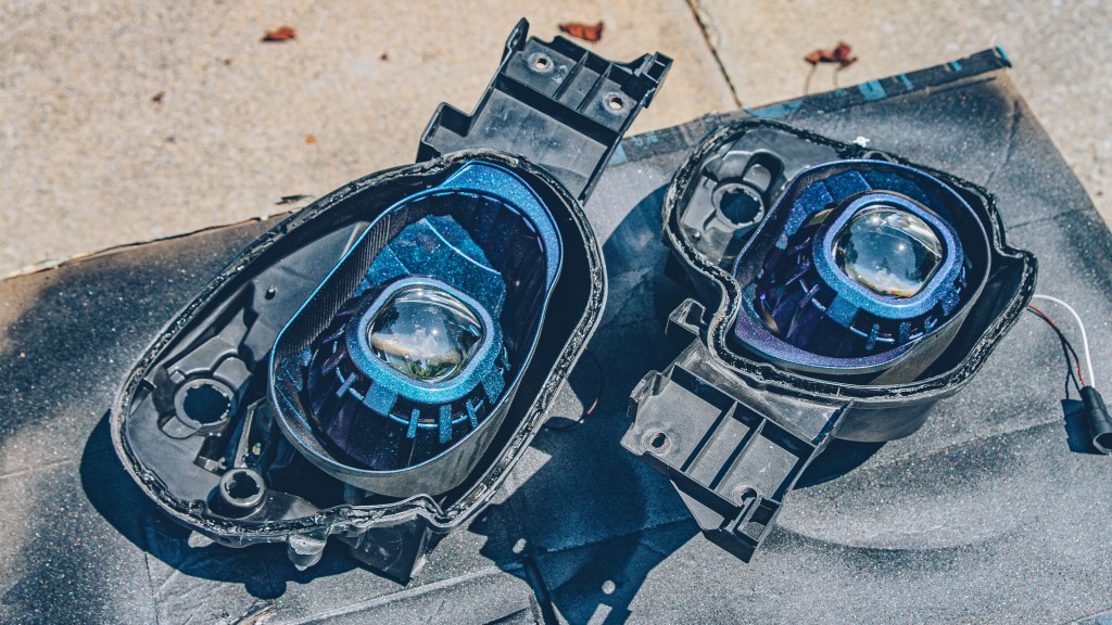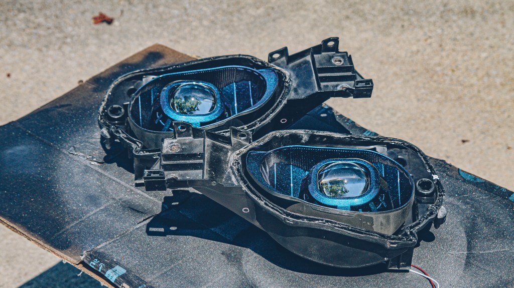 You will need to bake the headlights again to soften up the sealant. Setting them out in the sun may have worked too. However, this is when you two reassemble the two halves – the bezel goes back onto the lens and the projector/reflector bowl can be installed into the housing.