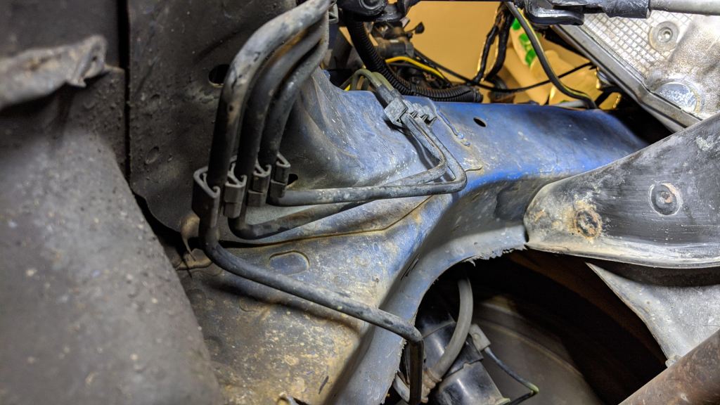 First thing I did was try and crack loose all of the M10x1.0 fittings on the ABS module, the master cylinder, the proportioning valve, and so on. Hit them all with penetrating oil beforehand as some of them were completely seized.