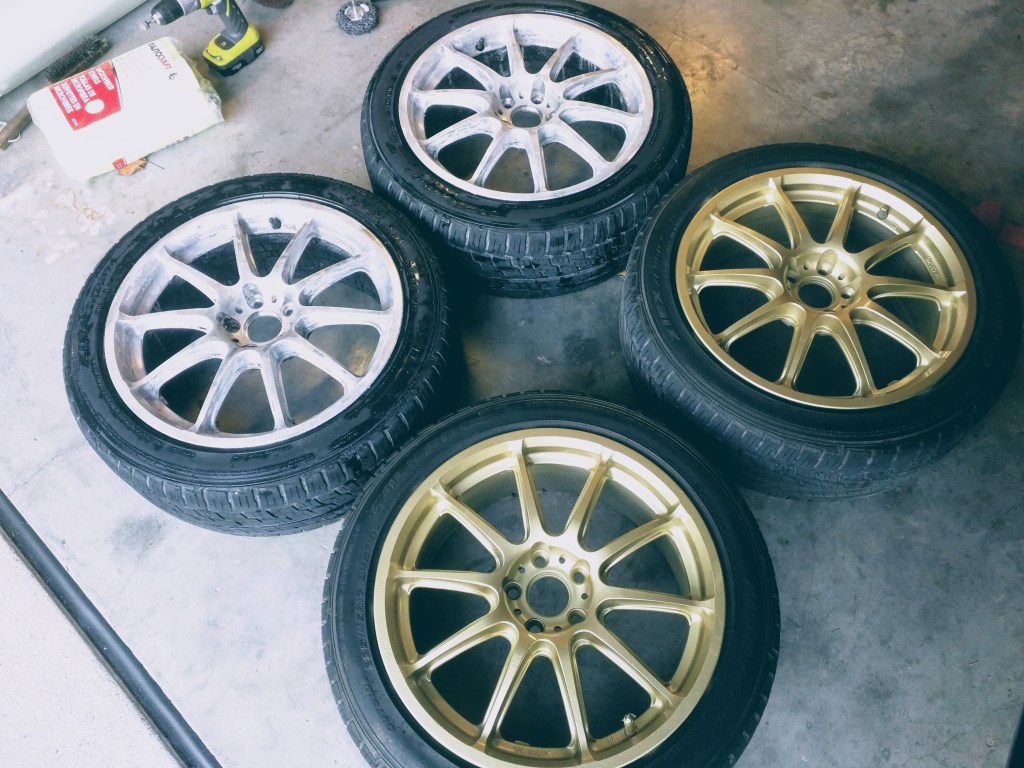 With the WRX running great, the next order of business was to paint the Rota Tarmac 2 wheels. They were in rough shape. They aren’t my favorite wheels either but I didn’t have any money to buy the wheels that I wanted.