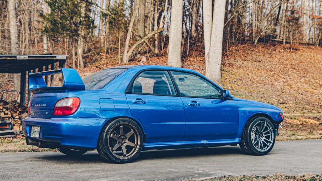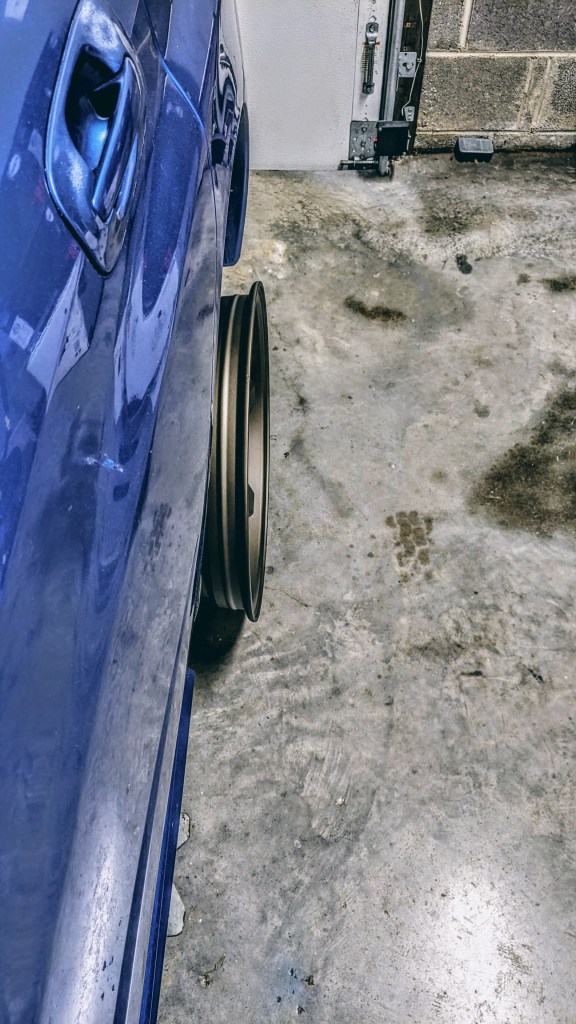 The rears will definitely need work to fit. Even with the car in the air, it is pretty clear that the rear wheels will poke. The dent on the passenger side rear quarter isn’t helping either.