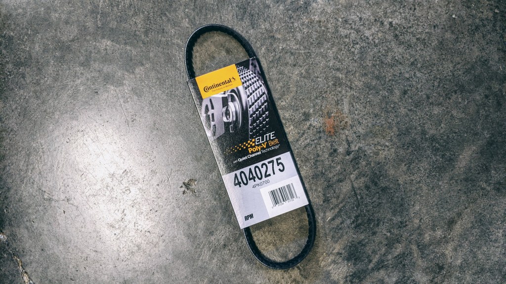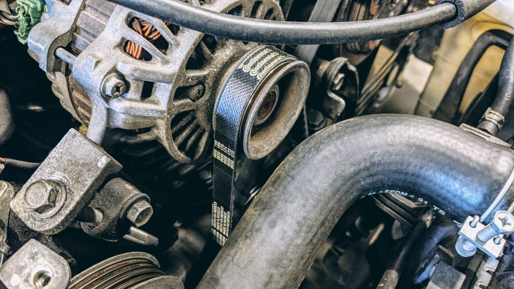 Since we no longer have a power steering pump we need a shorter belt. I have yet to find a 5-rib 27-inch belt but the 4-rib works. It just looks weird.