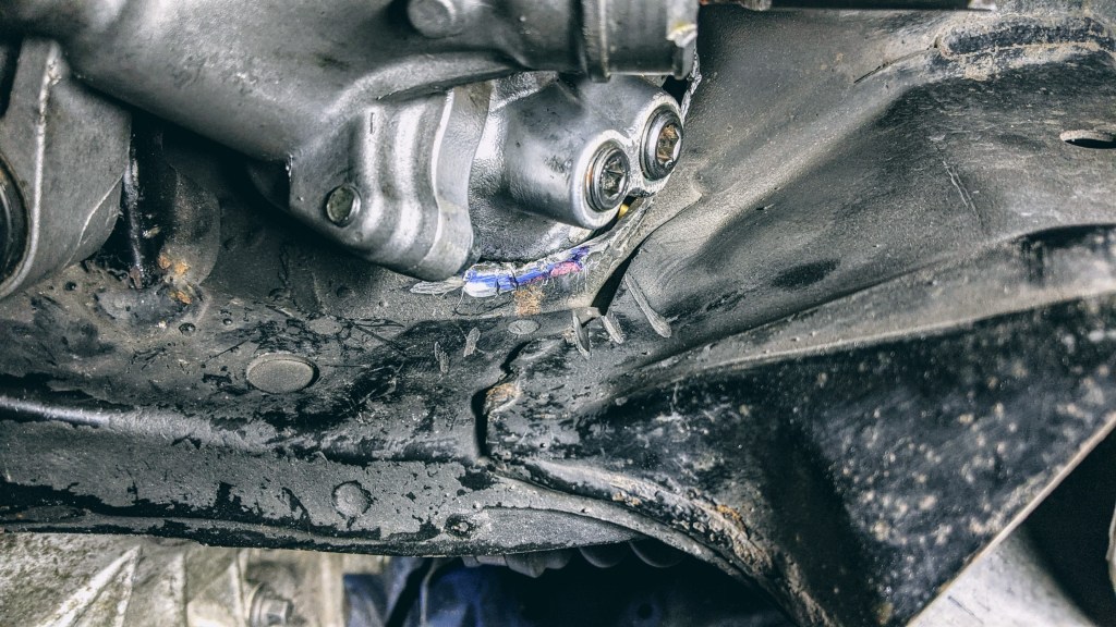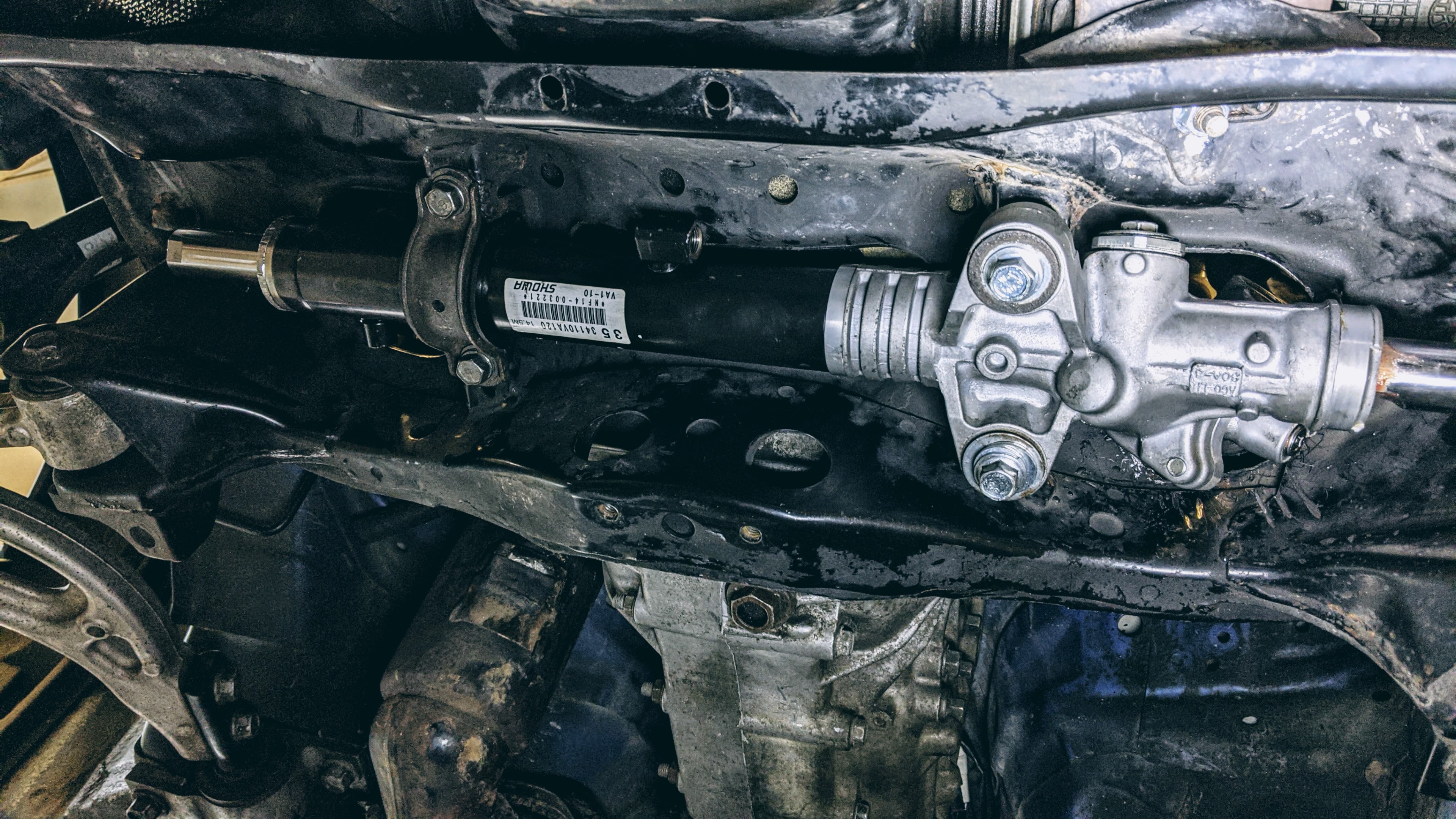 The biggest issue is opening up the subframe to accept the larger control valve housing on the VA STi rack. A 3-inch cutoff wheel or small reciprocating saw would ideal here. It is a tight space and it is difficult to see what you are doing. I managed to cut a few slots in the subframe and then break the tabs off with a vise grip. Then test fit again and cut some more. It is tedious as hell but it worked.