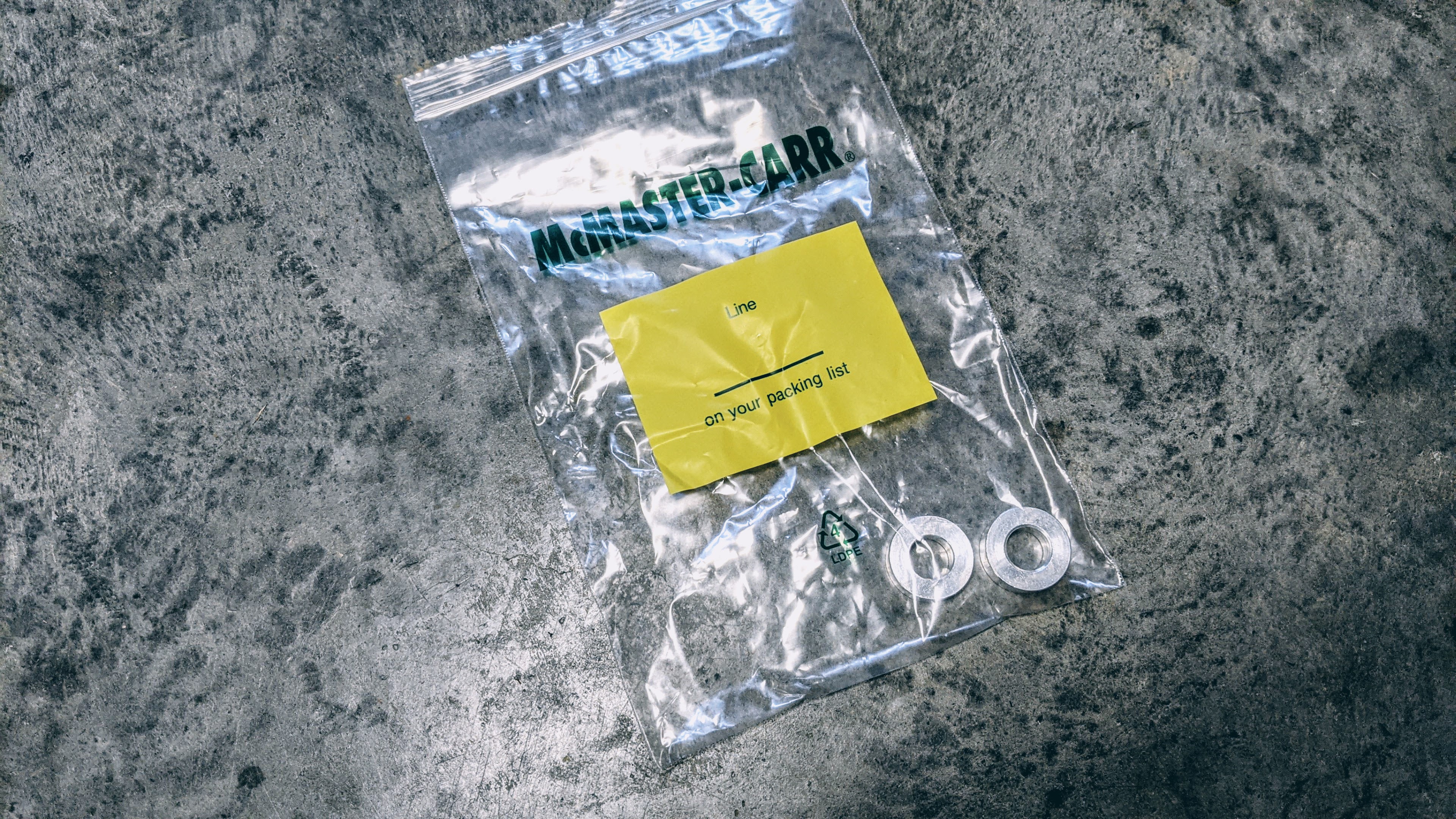 We need a spacer to accommodate the offset mounting points on the VA rack. I ordered these 1-inch OD, 3/8-inch thick aluminum spacers from McMaster-Carr. The OD is a little too small and they want to pull the bushings through the rack so we had to add a slightly bigger washer to them. We need longer bolts too, so I ordered two JIS M10x1.25x70mm bolts from Bolt Depot; 65mm bolts would probably work better, 70mm is a little long.