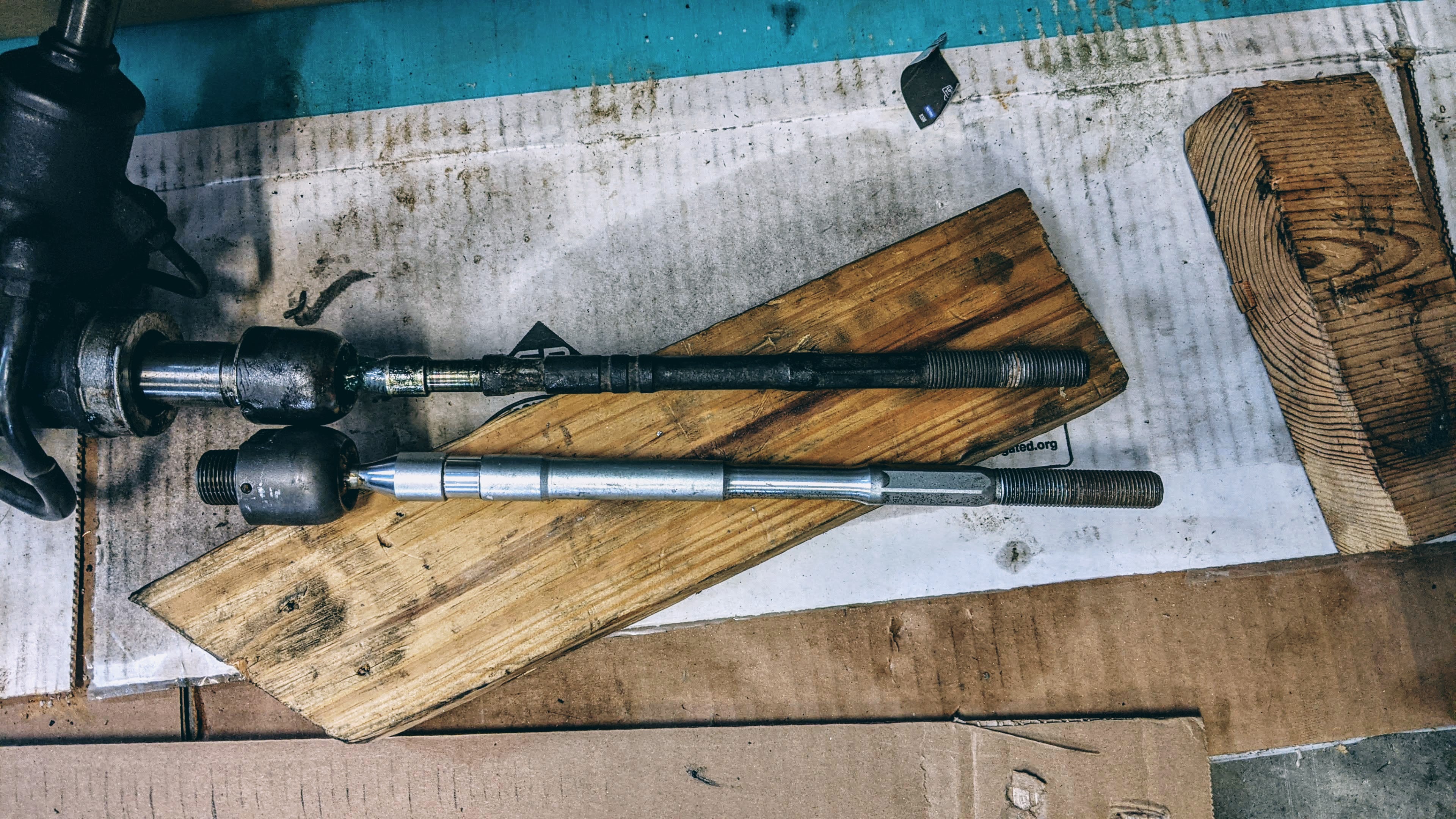 The next major issue is the inner tie rod ends. Below, we can see that the VA STi inner tie rods are longer than the GD sedan units. I initially wanted to use GD STi inners with thread adapters, but this project is way over budget and I just want to get this thing running for the summer.