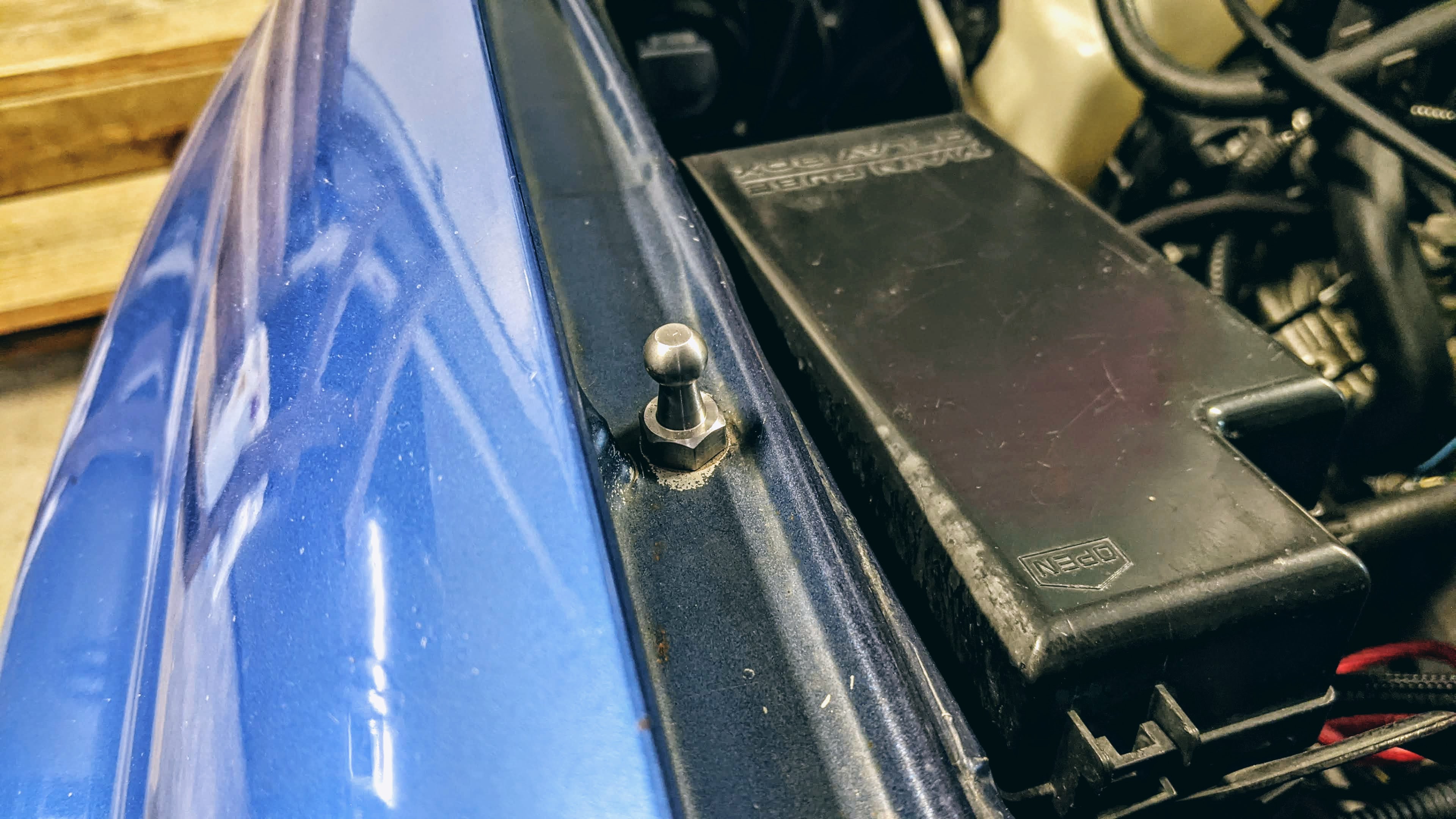 The install is pretty simple. We replace one of our fender bolts with a ball stud, then attach the bracket to the hood hinge — along with the other ball stud — and then install the struts on the studs.