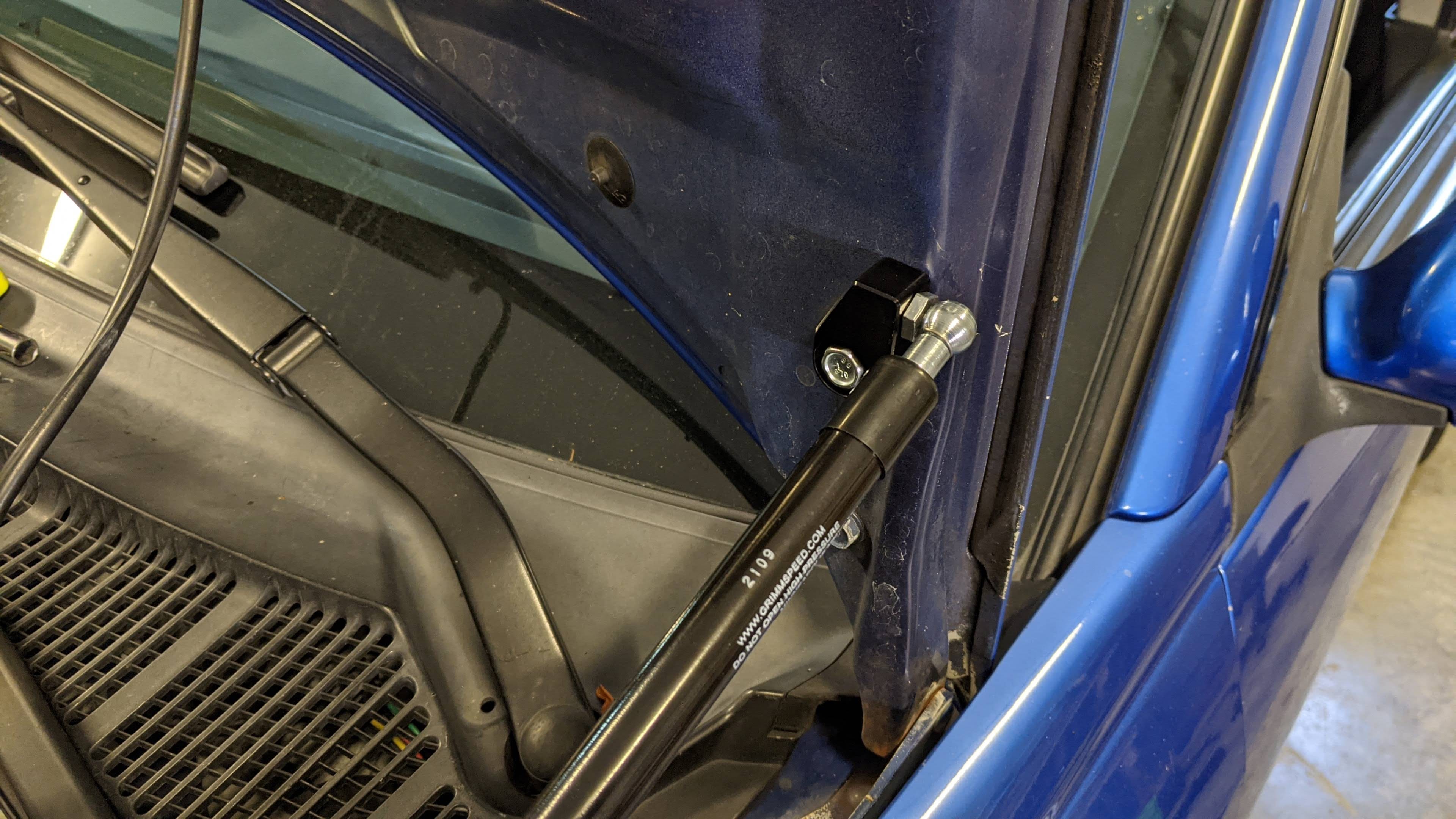 Success! We have a hood that won’t threaten us with bodily harm while checking the oil at a gas station.