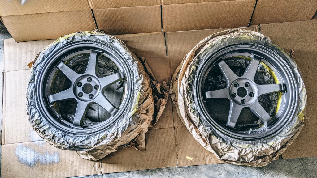 A while back, I painted my ESR wheels gunmetal or graphite to match the front wheels better. It wasn’t a perfect match, but it was better than the bronze color that they came in.