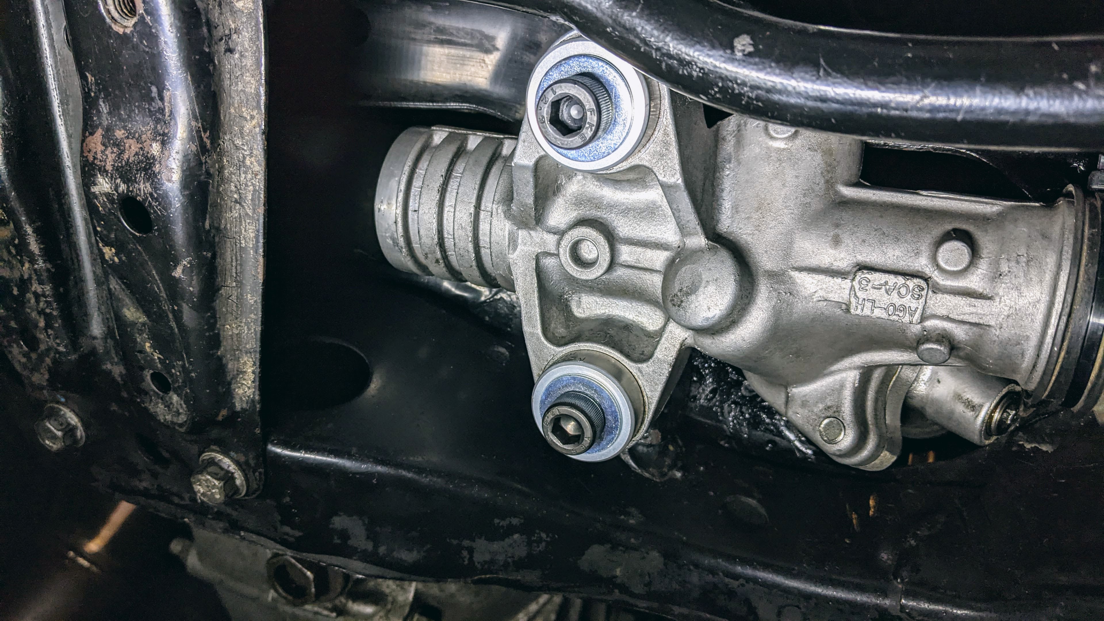 With the bushings removed, we can install the MSI bushings. The third bushing goes on top of the forward mounting spot. The bushings are not a tight fit so getting everything bolted up is quite fun. Next time, I will throw some painter’s tape on them or hold them in place.