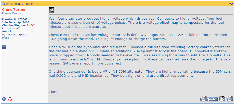There is a Nasioc thread over increasing the voltage of the alternator (up to 14.8v) to improve performance. They insert a diode into the ALT-S fuse in the engine bay and it tricks the voltage regulator to put out a bit more voltage.